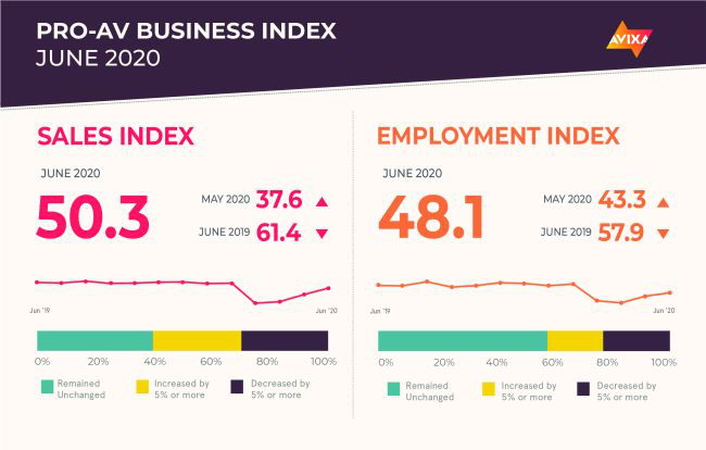 專業(yè)AV商業(yè)指數(shù)報告來自對AVIXA Insights社區(qū)的每月調查,該社區(qū)是行業(yè)成員的研究社區(qū),跟蹤商業(yè)AV的業(yè)務趨勢。該報告實際上包括兩個擴散指數(shù):AV銷售指數(shù)(AVI-S)和AV就業(yè)指數(shù)(AVI-E)。在每種情況下,指數(shù)均高于50表示銷售或就業(yè)活動有所增加。